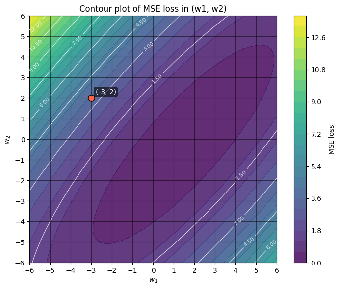 To get us oriented with this contour plot: the darker the color, the lower the MSE loss, and some of the contour lines are also labelled with the loss value. For example, the labelled point \((w_1, w_2) = (-3, 2)\) sits on the contour with an MSE loss of around 3.